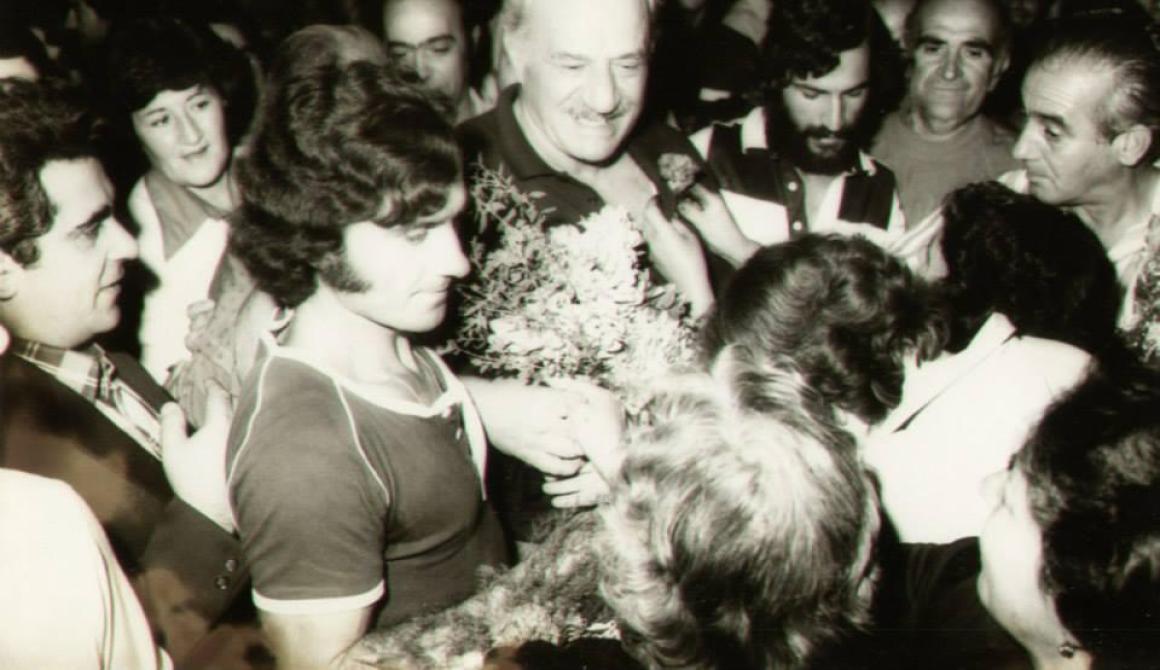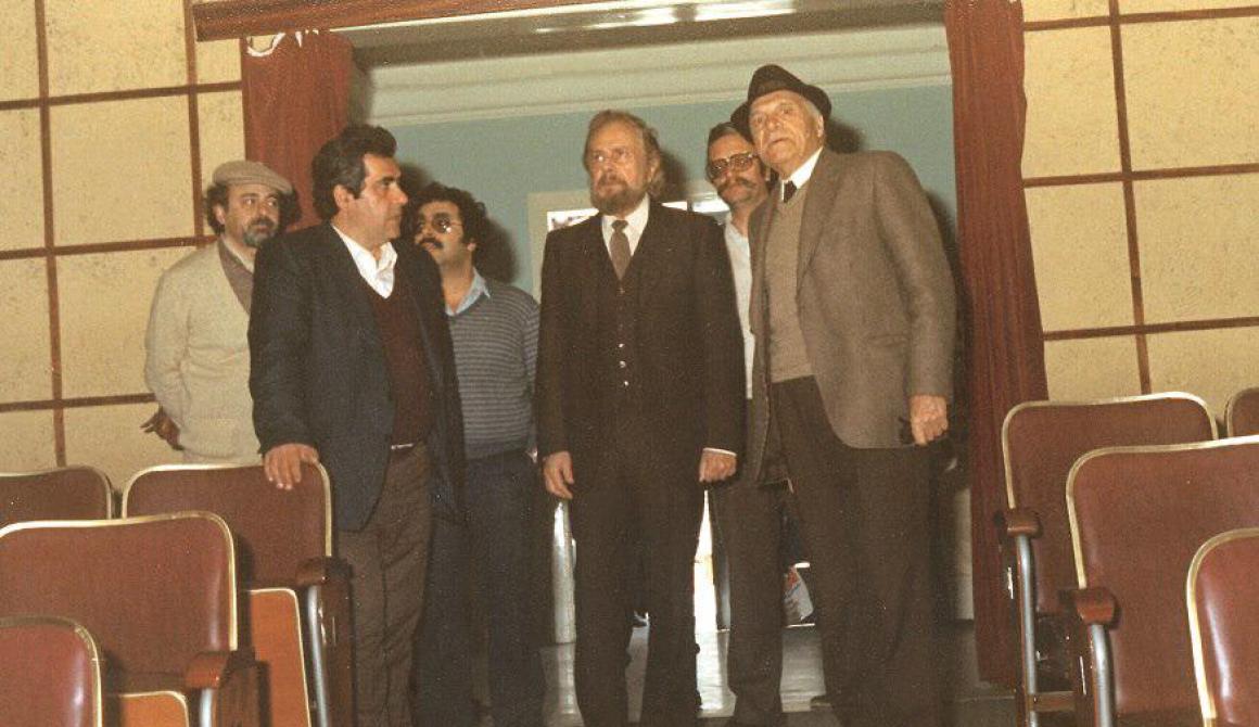 Ο μεγάλος ποιητής Γιάννης Ρίτσος στο κινηματοθέατρο του Αναγνωστηρίου (8-4-1985) περιστοιχιζόμενος από τους (από αριστερά) Ηλία Κουρτζή, Παναγιώτη Κουτρή, Δημήτρη Πατίλα, Απόστολο (Λάκη) Σαλαβόπουλο, Πάνο Πράτσο.
