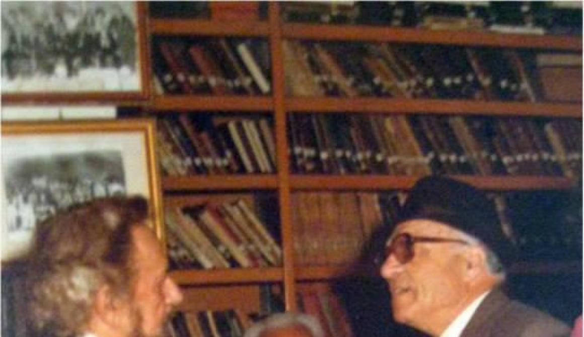 Ο Γιάννης Ρίτσος στη Βιβλιοθήκη του Αναγνωστηρίου (8-4-1985) ξεναγούμενος από τον πρόεδρο Πάνο Πράτσο. Παρακολουθεί ο γιατρός Στρατής Χατζηπροκοπίου (Χατζηβασ’λίνα).