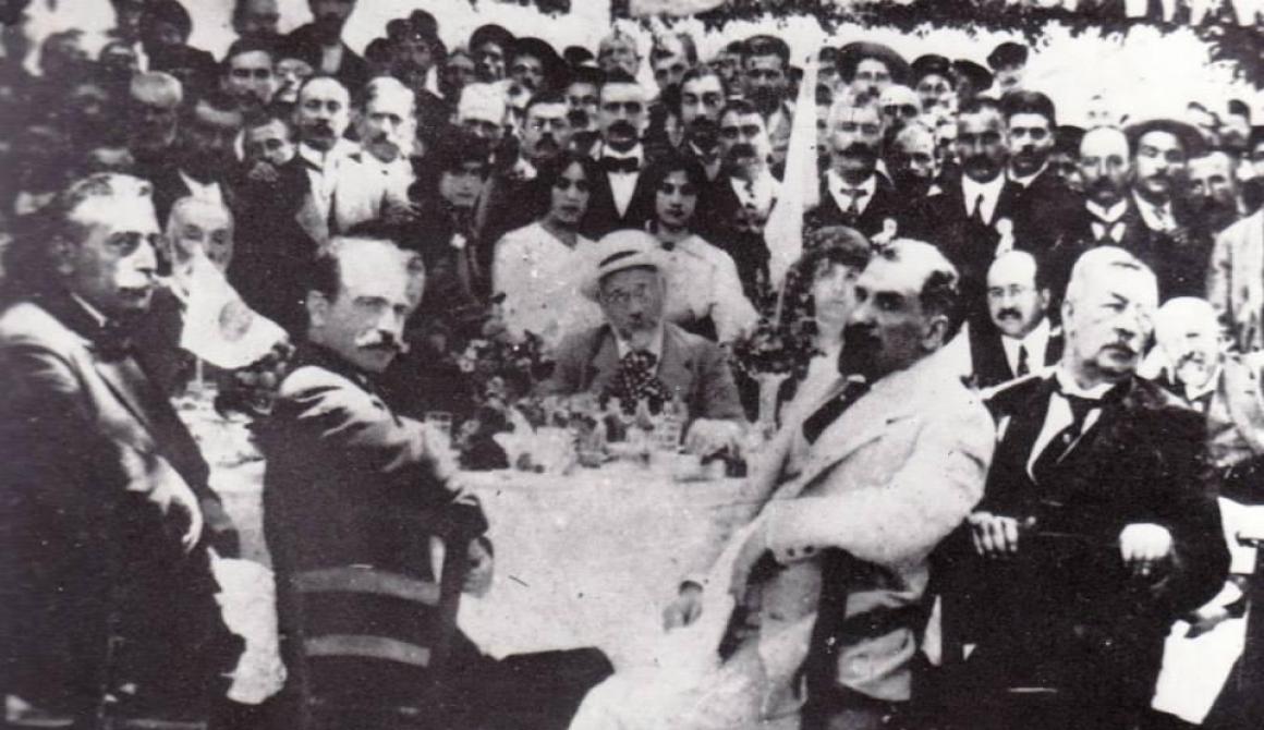 Ο Ελευθέριος Βενιζέλος στον Κήπο της Παναγίας (1916). Είναι ο εικονιζόμενος στη μέση της φωτογραφίας με το κουστούμι, το μουσάκι, τα γυαλιά και το άσπρο καβουράκι.