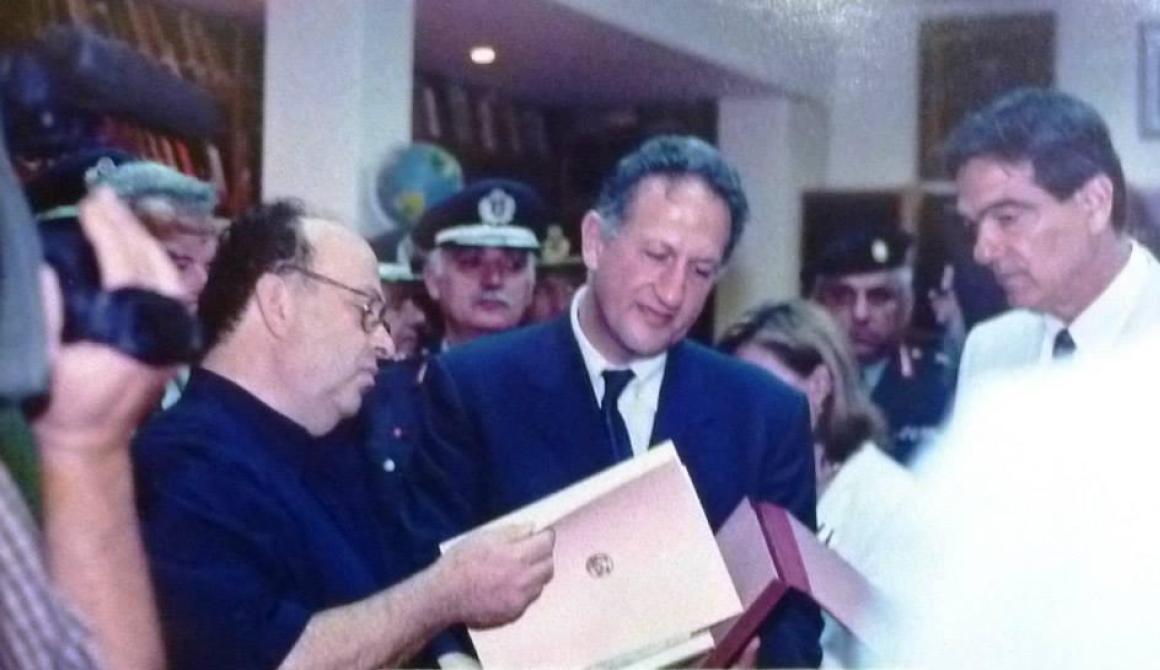 Ο πρόεδρος του Αναγνωστηρίου Αγιάσου Κλεάνθης Κορομηλάς προσφέρει στον υπουργό Εσωτερικών, Δημόσιας Διοίκησης και Αποκέντρωσης, Κώστα Σκανδαλίδη, τις εκδόσεις του ιδρύματος κατά την εκεί επίσκεψή του (16-8-2001). Δεξιά ο Νίκος Σηφουνάκης.