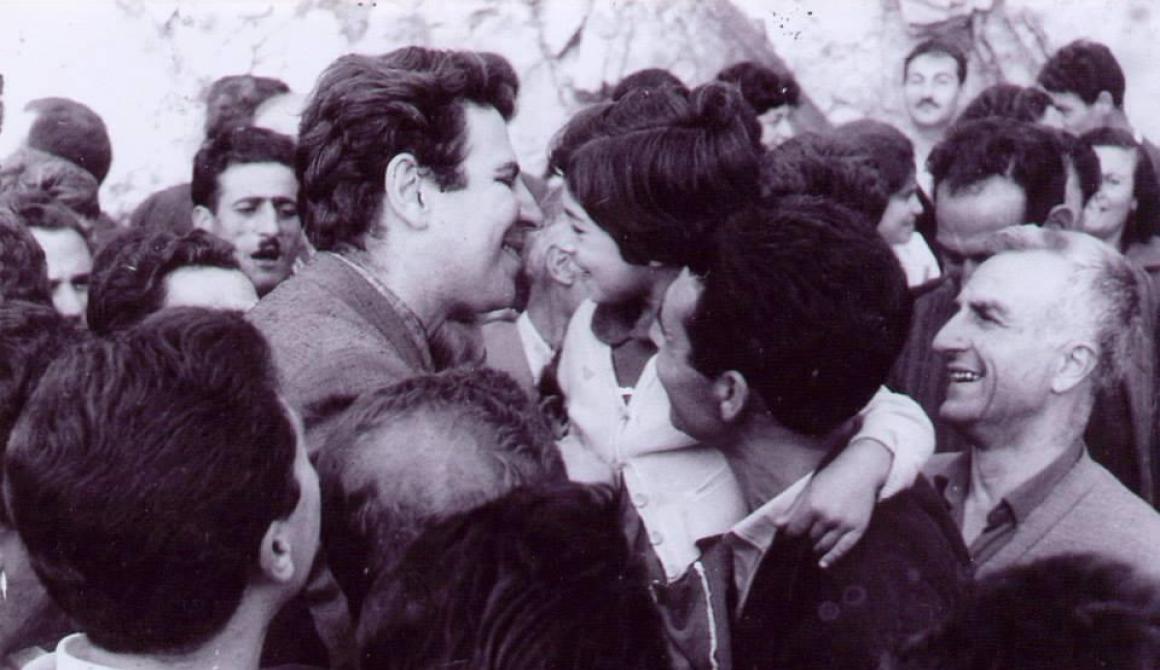 Ο Μίκης Θεοδωράκης επισκέπτεται στην Αγιάσο την εποχή της μεγάλης ακμής των Λαμπράκηδων (1963) και τυχαίνει της πάνδημης υποδοχής του λαού της. Διακρίνονται μεταξύ άλλων (από αριστερά) οι Χριστόφας Κουφέλος, Ειρήνη Αγρίτη-Τσαλίκη (το κοριτσάκι που ασπάζεται ο Μίκης), Μιχάλης Αγρίτης (ο πατέρας της που την κρατά στην αγκαλιά του), Παναγιώτης Παπάνης (Μαθιός).