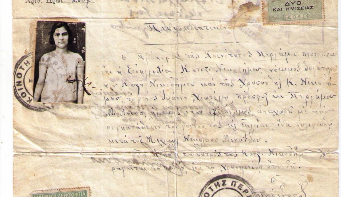 «Ο πρόεδρος της Κοινότητος Περγάμου πιστοποιεί ότι η Ευαγγελία Κωνστ. Νικοδήμου, νόμιμος θυγάτηρ του Κωστή Νικοδήμου και της Χρυσάνθης Κ. Νικοδήμου, το γένος Ιωάννου Χιωτέλλη, πρόσφυξ εκ Περγάμου Μ. Ασίας, ηλικίας ετών 17, άγαμος, αναχωρεί με την συγκατάθεσιν των γονέων της εις Γαλλίαν, ίνα νυμφευθή μετά του Μιχαήλ Νικολάου Μιναίδου.