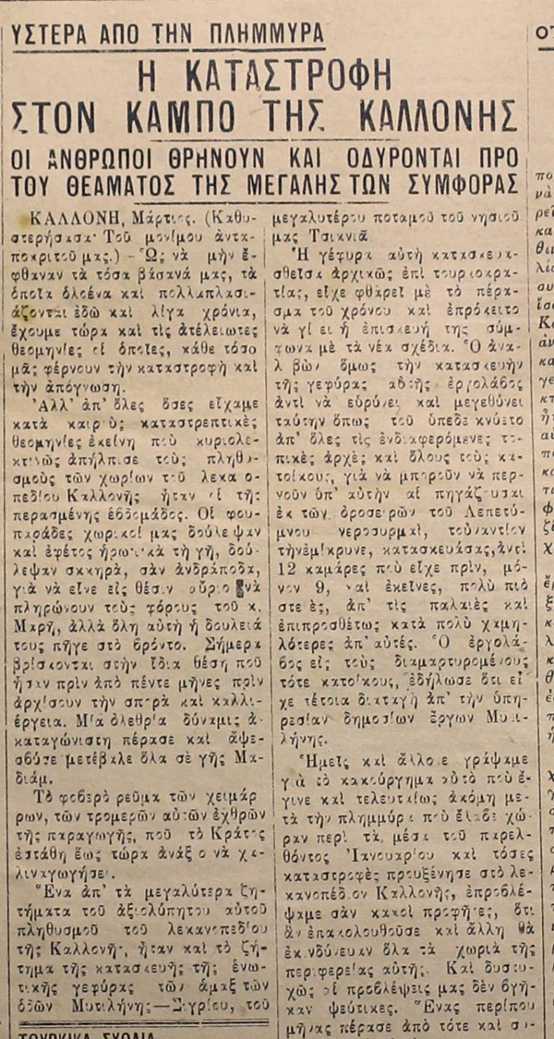«Η θέσις όχι μόνον των κατοίκων της Καλλονής αλλά και όλων των χωριών εξακολουθεί να είναι τραγικώς απελπιστική».