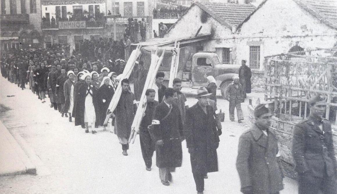Κυριακή, παραμονή Χριστουγέννων του 1944. Στις εφτά το πρωί μαθαίνεται σ’ όλη την πόλη, πως απ’ την αυγή άραξαν έξω απ’ το λιμάνι έξι καράβια, μεταγωγικά γεμάτα «μαύρους» (βρετανικά αποικιοκρατικά στρατεύματα, στελεχωμένα κυρίως από Ινδούς) και τρία πολεμικά εγγλέζικα. Στα Μπλόκια είχαν κιόλας ξεφορτώσει έξι στρατιωτικά αυτοκίνητα. Η μέρα είναι βαριά και κρύα. Φυσά δυνατός αγέρας κι ώρες - ώρες ρίχνει χιονόνερο. Τα χωνιά γυρίζουν στις γειτονιές και ειδοποιούν τον κόσμο. «Νιάτα και λαέ! Εμπρός, όλοι. Άντρες, γυναίκες και παιδιά να ζητήσουμε να φύγουν απ’ το νησί μας οι μαύροι. Θάνατος στο φασισμό - Λευτεριά στο λαό!».