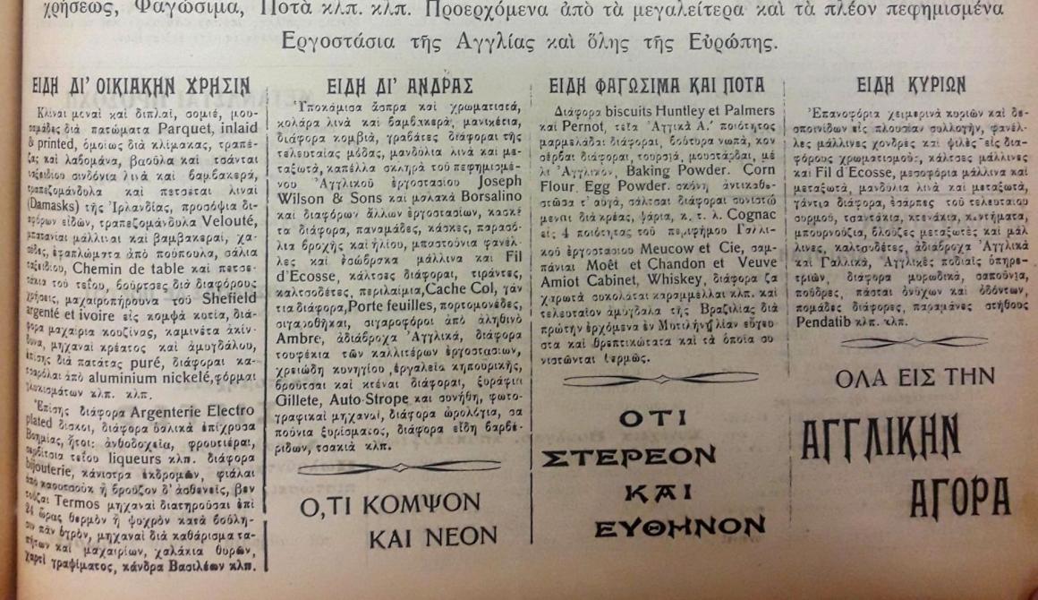 Η διαφήμιση της εποχής, που δημοσιεύτηκε στην εφημερίδα «Λέσβος» τον Νοέμβριο του 1913, υποσχόταν έναν μικρό παράδεισο «ἀπὸ τὰ μεγαλείτερα καὶ πλέον πεφημισμένα ἐργοστάσια τῆς Ἀγγλίας καὶ τῆς Εὐρώπης».