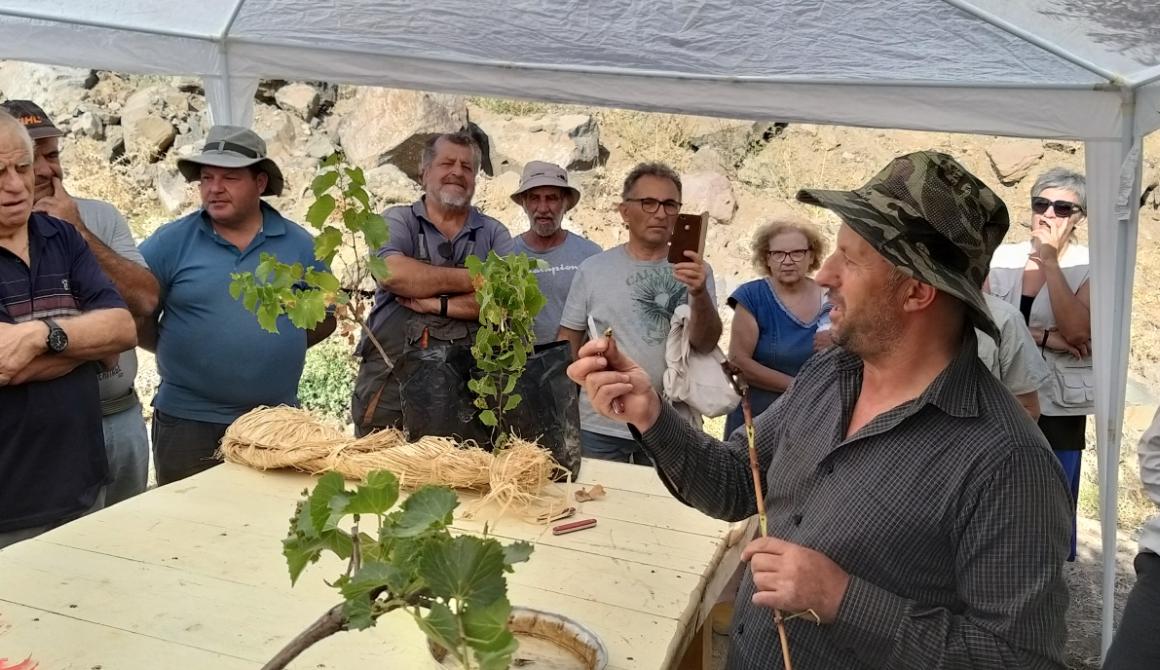 Το ενδιαφέρον κυρίως των ερασιτεχνών αμπελουργών ήταν έντονο. Οι ερωτήσεις, οι απορίες και οι διευκρινήσεις διαδέχονταν η μία την άλλη, ενώ τα ειδικά σουγιαδάκια άλλαζαν συνεχώς χέρια, με τους παρευρισκόμενους να δοκιμάζουν στην πράξη τη συγκεκριμένη τεχνική είτε για την αφαίρεση οφθαλμών από τις εμβολιοφόρες κληματίδες, είτε για τη δημιουργία εγκοπών στο υποκείμενο, οι οποίες προορίζονταν για την εφαρμογή των εμβολίων. Σημαντικές παράμετροι το δέσιμο και το παράχωμα του σημείου, ώστε να προστατευτούν από τις καιρικές συνθήκες, μέχρι την άνοιξη, οπότε και θα ελεγχθεί η επιτυχία του εμβολιασμού.