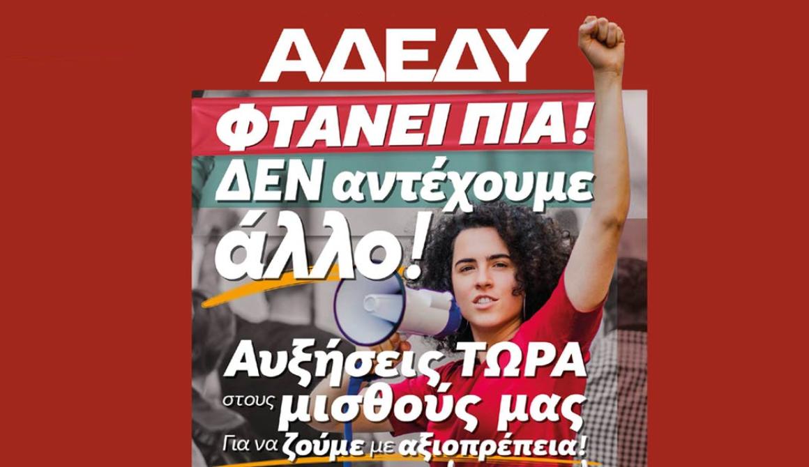 Η ΓΕΝΙΚΗ ΑΠΕΡΓΙΑ της 9ης του Νοέμβρη, που γίνεται μαζί με τους εργαζόμενους στον ιδιωτικό τομέα, έχει ως στόχο να θέσει τέρμα σε αυτή την πολιτική. Σήμερα με επίσημο πληθωρισμό πάνω από 11% είναι η ώρα να διεκδικήσουμε να ζούμε με αξιοπρέπεια από τον μισθό μας. Είναι η ώρα να πούμε όλοι μαζί ΦΤΑΝΕΙ ΠΙΑ!