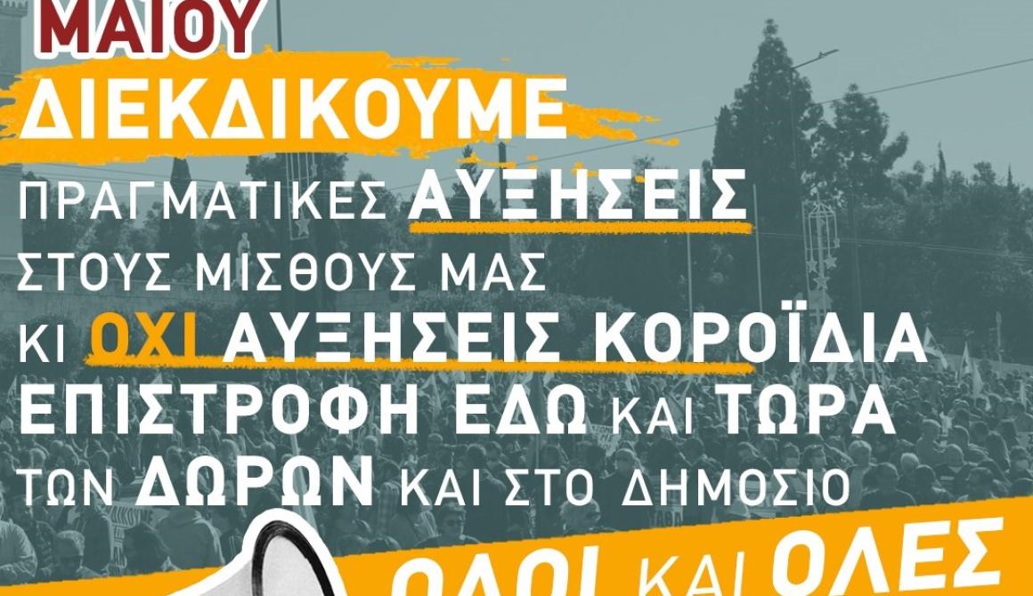 Στις 21 του Μάη συνεχίζουμε τον αγώνα με νέα απεργία και διεκδικούμε ζωή με δικαιώματα, δουλειά με πραγματικές αυξήσεις κι όχι αυξήσεις – κοροϊδία του 1,5 ευρώ τη μέρα, ουσιαστικά μέτρα αντιμετώπισης της ακρίβειας.