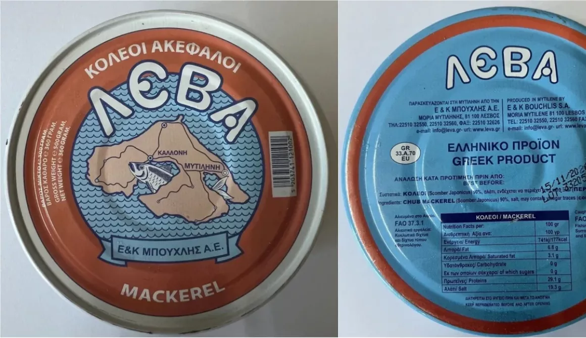Πρόκειται για προϊόν με ημερομηνία ελάχιστης διατηρησιμότητας 15/11/2026, αριθμό παρτίδας 33205023H, σε λευκοσιδηρή συσκευασία καθαρού βάρους 360 γρ., μεικτού βάρους 500 γρ., που παρασκευάζεται από την εταιρεία «Ε. & Κ. ΜΠΟΥΧΛΗΣ ΑΕ» με έδρα στη Μόρια Λέσβου.