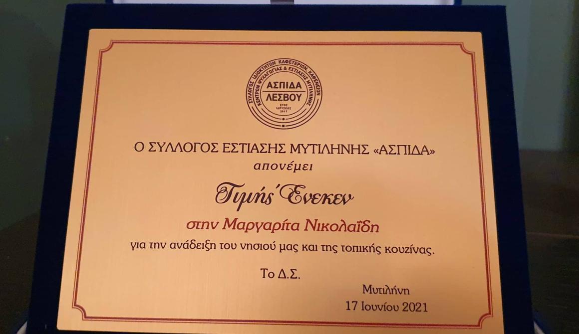 Ο Σύλλογος Εστίασης Μυτιλήνης «ΑΣΠΙΔΑ» βράβευσε την νικήτρια του MASTER CHEF Μαργαρίτα Νικολαϊδη για την ανάδειξη του νησιού μας και της τοπικής κουζίνας μέσω του τηλεοπτικού διαγωνισμού.