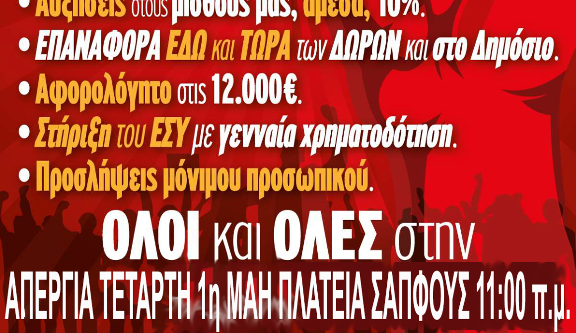 Κάλεσμα ΑΔΕΔΥ Λέσβου - Πρωτομαγιά στην Πλατεία Σαπφούς