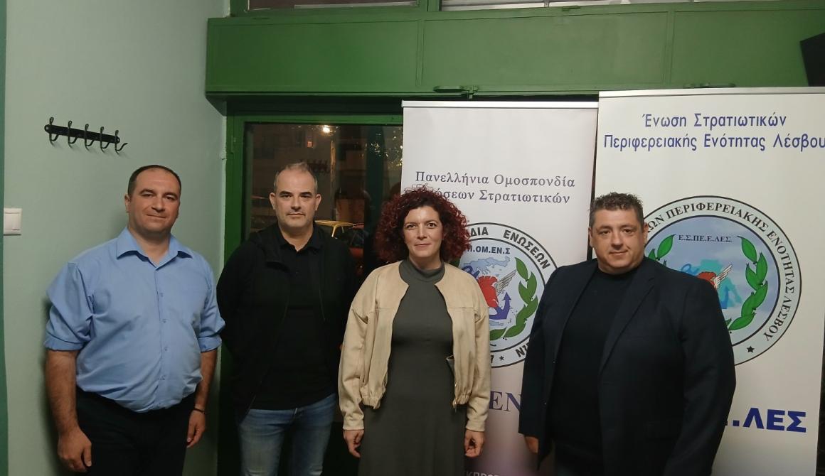 Μετά την πρόσφατη συνάντηση με τον βουλευτή του ΠΑΣΟΚ Παναγιώτη Παρασκευαΐδη, αντιπροσωπεία της ΕΣΠΕΕΛΕΣ, αποτελούμενη από τον Πρόεδρο Ταγματάρχη (ΤΔ) Ευστράτιο Χαραλαμπέλλη, τον Γενικό Γραμματέα Υποσμηναγό (ΤΕΑ) Σταμάτιο Κατσαμπή και το μέλος του Δ.Σ. Ανθυπασπιστή (ΦΠΖ) Παναγιώτη Λύμπο, συναντήθηκε το Σάββατο 25 Οκτωβρίου 2025 με τη βουλευτή Λέσβου του ΚΚΕ, Μαρία Κομνηνάκα, παρουσία του Κυριάκου Βαξεβάνη, μέλους της Τομεακής Επιτροπής Λέσβου του ΚΚΕ.
