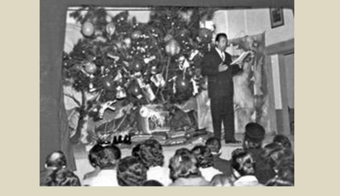 Στην φωτογραφία, ευγενική παραχώρηση του φίλου Στρατή Προδρόμου, ο τότε Διευθυντής του Δημοτικού Σχολείου, αείμνηστος Παναγιώτης Προδρόμου, εκφωνεί τον χαιρετιστήριο λόγο σε κάποια γιορτή του χριστουγεννιάτικου δέντρου.