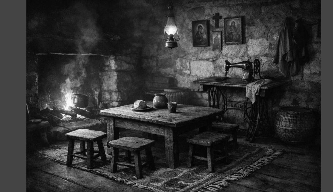 Αναμμένο το τζάκι στον πίσω ασβεστωμένο τοίχο της κάμαρης, έκανε και χρέη μαγειρικής κουζίνας, με δυο σιδερένιες πυροστιές, κρεμασμένες στη μία πλευρά του. Η μια μεγάλη, για το ζέσταμα του νερού στη μικρή «μπακύρα» κι η άλλη, η μικρότερη, για το τσουκάλι. Ένας στρογγυλός ξύλινος «σοφράς», καλυμμένος με κόκκινο, της κρεββατής, υφαντό τραπεζομάντηλο, με τέσσερα χαμηλά σκαμνάκια γύρω του, χρησίμευε για το φαγητό της οικογένειας. Το σιδερένιο, μονό και στρωμένο κρεβάτι, κολλητό στο ανατολικό τοίχο, για τη μάνα του σπιτιού, είχε δίπλα του τη ξύλινη, δίφυλλη ντουλάπα. Που με τα δυο της εσωτερικά συρτάρια, χωρούσε όλο τον ρουχισμό της οικογένειας, χειμωνιάτικο και καλοκαιρινό. Στον απέναντι τον τοίχο μια μεγαλούτσικη κασέλα κι ένα φτηνιάρικο μπαούλο, έκρυβαν μέσα τους όλα εκείνα, ακόμα κι σ’ ένα φτωχόσπιτο, χρειαζούμενα. Και παραδίπλα, μια και μοναδική ψάθινη καρέκλα.