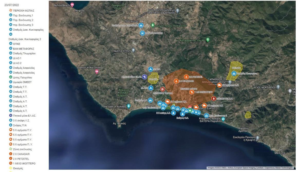 Διατίθενται πάνω από -60- αστυνομικοί, -23- οχήματα και πτητικό μέσο, που συνδράμουν ουσιαστικά, στην προληπτική εκκένωση οικισμών και με κυκλοφοριακές ρυθμίσεις πλησίον περιοχών όπου εξελίσσεται η πυρκαγιά