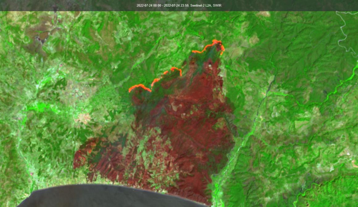 Εικόνα 1. Δορυφορική αποτύπωση της έκτασης που έχει επηρεαστεί (23.07.2022 10:00 έως 24.07.2022 12:00) από τη δασική πυρκαγιά στα Βατερά Λέσβου.