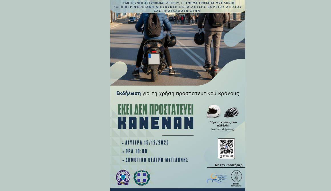 Με σύνθημα «Εκεί δεν προστατεύει κανέναν», η εκδήλωση φιλοδοξεί να ανατρέψει –με στοιχεία, εικόνες και ανοιχτή συζήτηση– την επικίνδυνη συνήθεια πολλών νέων να μεταφέρουν το κράνος… στο χέρι αντί στο κεφάλι. Η αφίσα της δράσης, που απεικονίζει νέους να κινούνται σε δρόμο της Μυτιλήνης κρατώντας το κράνος δίπλα τους, μεταφέρει με ωμή ειλικρίνεια το κεντρικό μήνυμα: η συνήθεια αυτή δεν προσφέρει καμία ασφάλεια και καμία δικαιολογία.