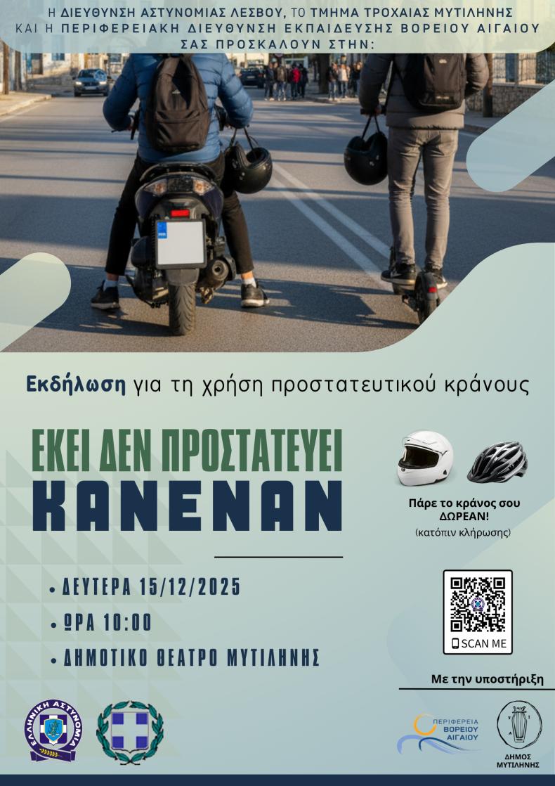 Η Διεύθυνση Αστυνομίας Λέσβου, το Τμήμα Τροχαίας Μυτιλήνης και η Περιφερειακή Διεύθυνση Εκπαίδευσης Βορείου Αιγαίου ενώνουν δυνάμεις σε μια δράση ουσίας, που στοχεύει κατευθείαν στον πυρήνα της οδικής ασφάλειας: τη σωστή και συστηματική χρήση προστατευτικού κράνους από μαθητές και νέους οδηγούς.
