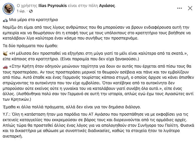 Ο ένας από τους δύο πρωταγωνιστές ήταν ο Ηλίας Ψυρούκης (γνωστός από τις καταγγελίες για την κακοποίηση των ζώων σε πανηγύρια της Λέσβου). Λίγες ώρες μετά την αθώωσή του σε μια εξαιρετικά ενδιαφέρουσα ανάρτησή του αναφέρει: