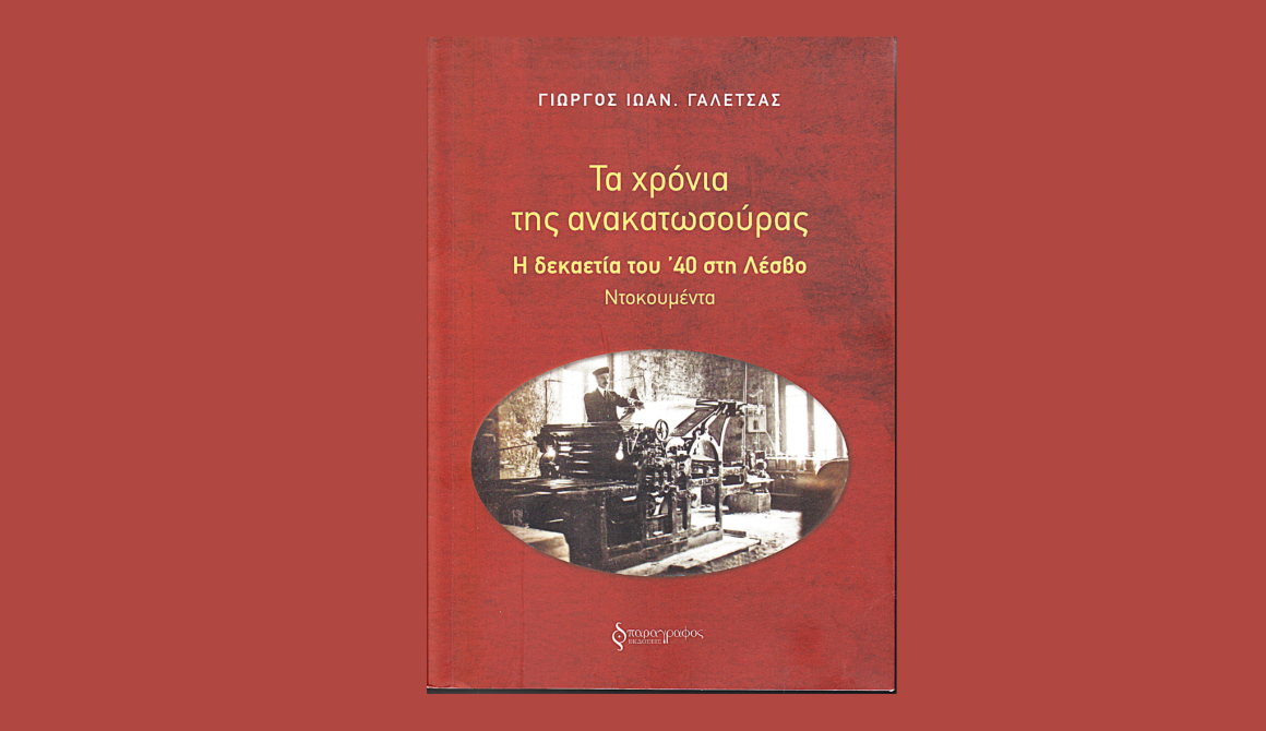 Η Λέσβος αποκτά ένα ακόμη σημαντικό τεκμήριο για τη νεότερη ιστορία της. Κυκλοφόρησε από τις Εκδόσεις «Παράγραφος» το νέο βιβλίο του Γιώργου Γαλέτσα με τίτλο «Τα χρόνια της ανακατωσούρας. Η δεκαετία του '40 στη Λέσβο», ένα έργο που φιλοδοξεί να φωτίσει με συστηματικό και τεκμηριωμένο τρόπο μία από τις πιο ταραγμένες και καθοριστικές περιόδους του 20ού αιώνα για το νησί.