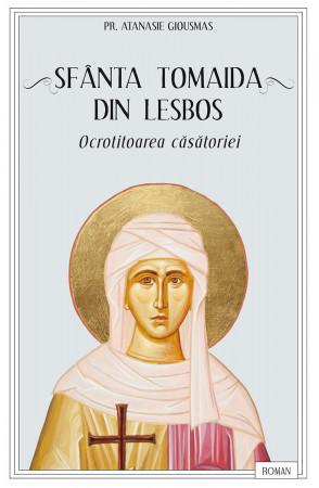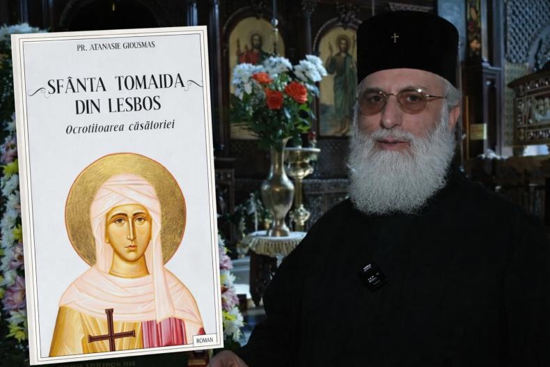 Το εξώφυλλο της ρουμανικής έκδοσης του βιβλίου «Sfânta Tomaida din Lesbos, ocrotitoarea căsătoriei» πλαισιώνεται από τον συγγραφέα του, π. Αθανάσιο Γιουσμά, σε έναν συμβολικό διάλογο πίστης, λόγου και μνήμης, που συνδέει τη Λέσβο με τον ευρύτερο ορθόδοξο κόσμο.