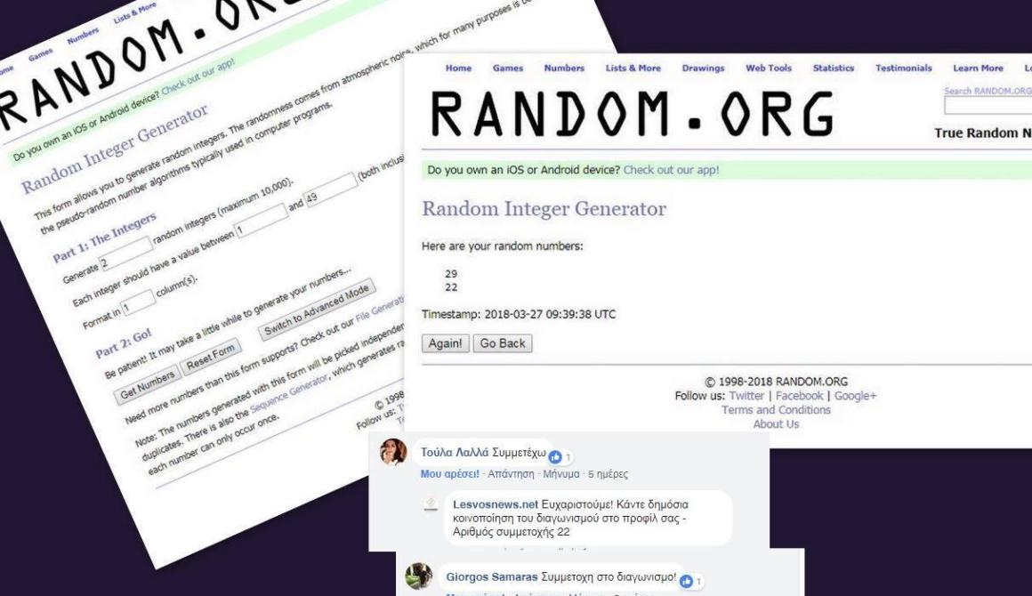 Η κλήρωση έγινε με τη βοήθεια της ιστοσελίδας random ( ζητήσαμε 2 τυχαίους αριθμούς από 1- 49). Επιλέγησαν οι αριθμοί 22-29