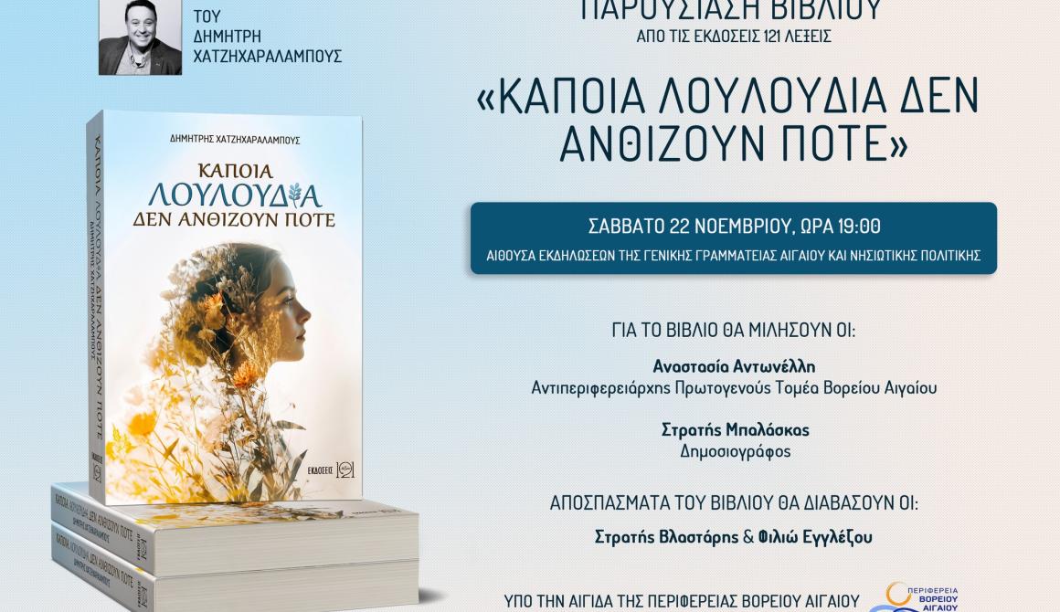 Μια βραδιά λογοτεχνικής αύρας και εσωτερικής συγκίνησης ετοιμάζεται να ζήσει η Μυτιλήνη, καθώς το νέο βιβλίο του Δημήτρη Χατζηχαραλάμπους, με τίτλο «Κάποια Λουλούδια Δεν Ανθίζουν Ποτέ», παρουσιάζεται επίσημα το Σάββατο 22 Νοεμβρίου, στις 19:00, στην Αίθουσα Εκδηλώσεων της Γενικής Γραμματείας Αιγαίου και Νησιωτικής Πολιτικής.