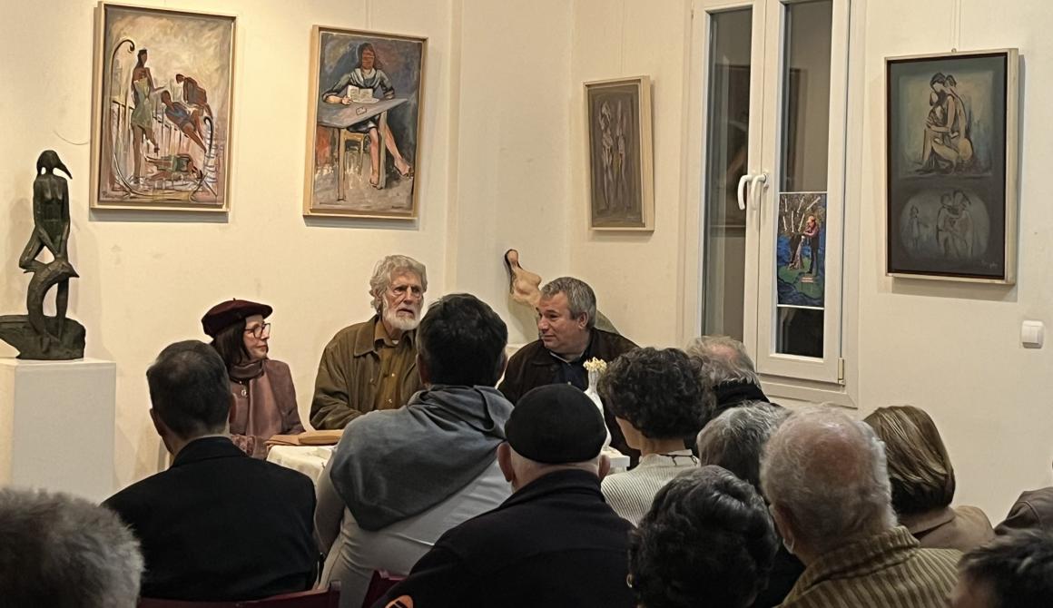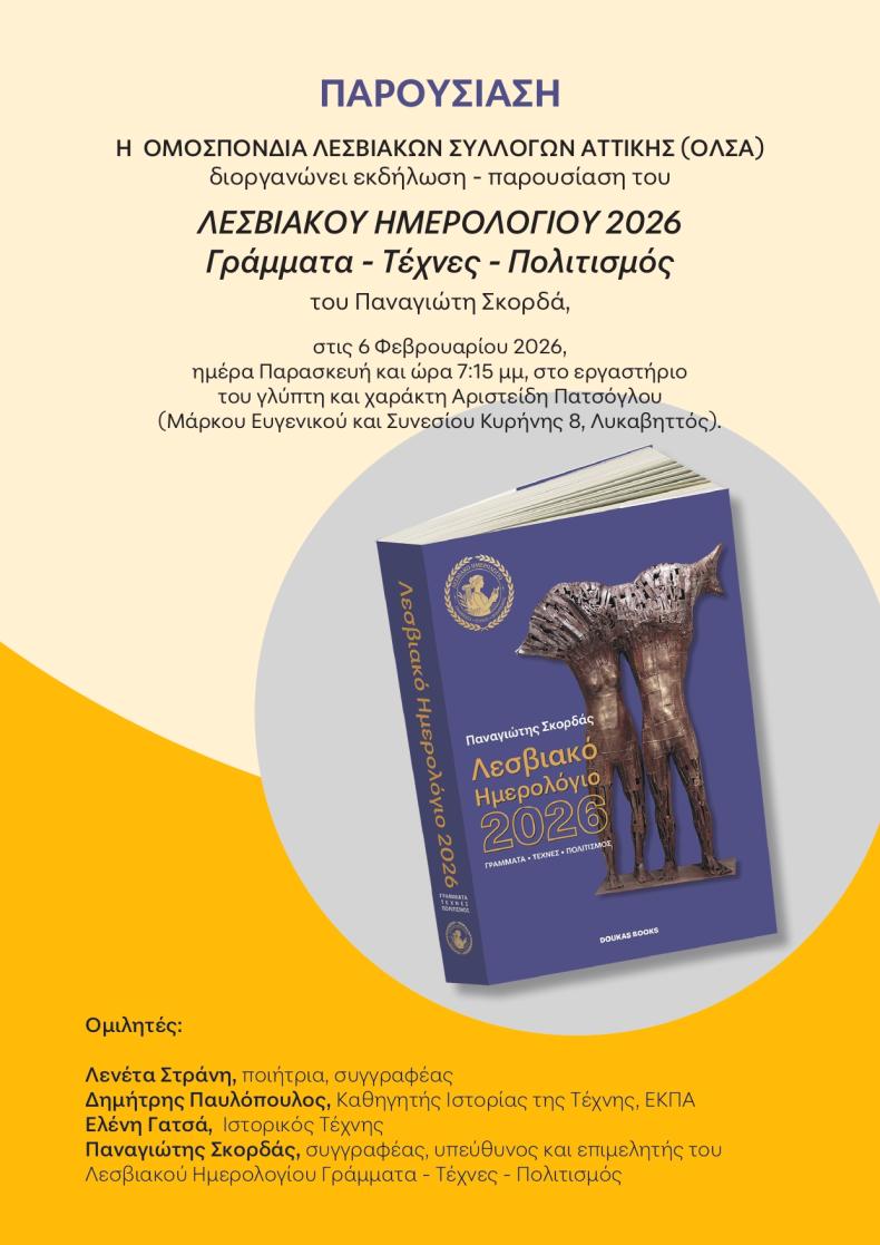 ΑΘΗΝΑ. Ανάμεσα σε πίνακες, γλυπτά και χαρακτικά έργα, καρπούς μιας πολυσχιδούς καλλιτεχνικής προσωπικότητας, πραγματοποιήθηκε η παρουσίαση του «Λεσβιακού Ημερολογίου 2026. Γράμματα – Τέχνες – Πολιτισμός» του Παναγιώτη Σκορδά, την Παρασκευή το απόγευμα, στο εργαστήριο του τιμώμενου στη φετινή έκδοση Λέσβιου δημιουργού Αριστείδη Πατσόγλου.