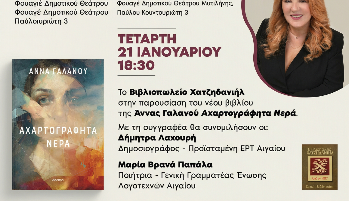 Η εκδήλωση θα πραγματοποιηθεί στη Μυτιλήνη, σε μια βραδιά αφιερωμένη στη λογοτεχνία και τη δημιουργική συζήτηση.