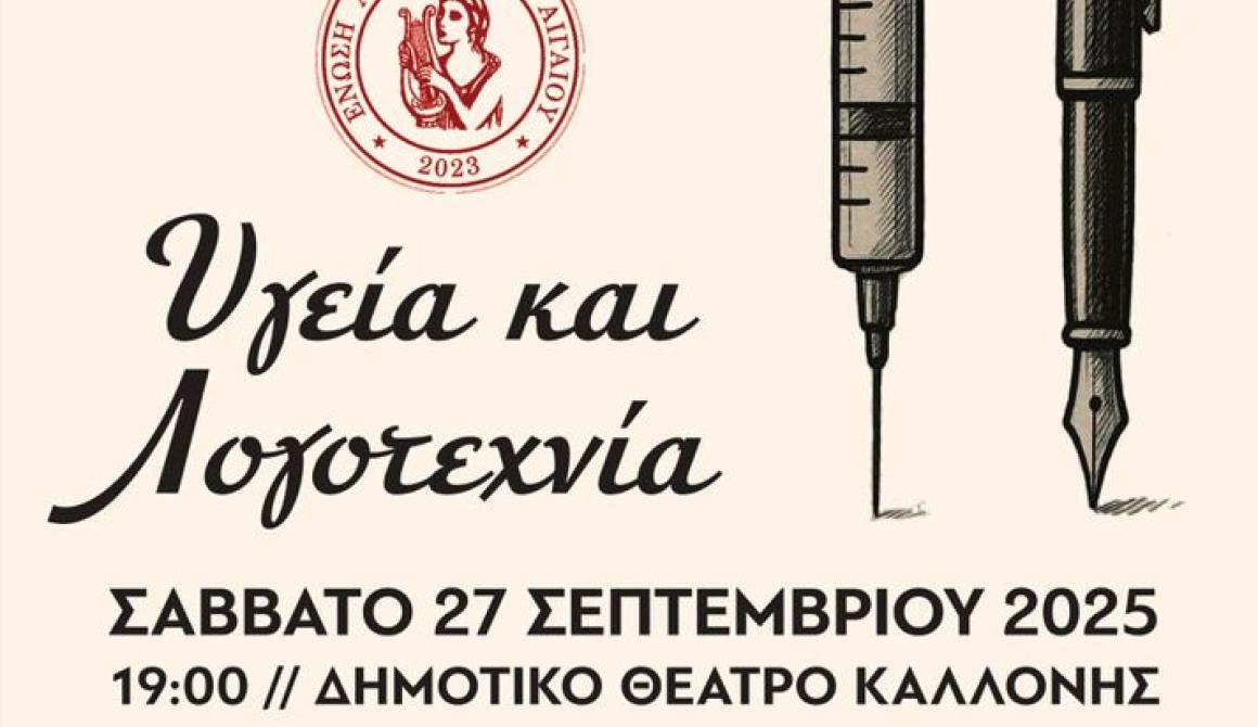 Η Περιφέρεια Βορείου Αιγαίου - Αντιπεριφέρεια Πολιτισμού σας προσκαλεί στην εκδήλωση με τίτλο «Υγεία και Λογοτεχνία» που διοργανώνει σε συνεργασία με την Ένωση Λογοτεχνών Αιγαίου, το Σάββατο, 27 Σεπτεμβρίου, στο Δημοτικό Θέατρο Καλλονής, στις 19.00.