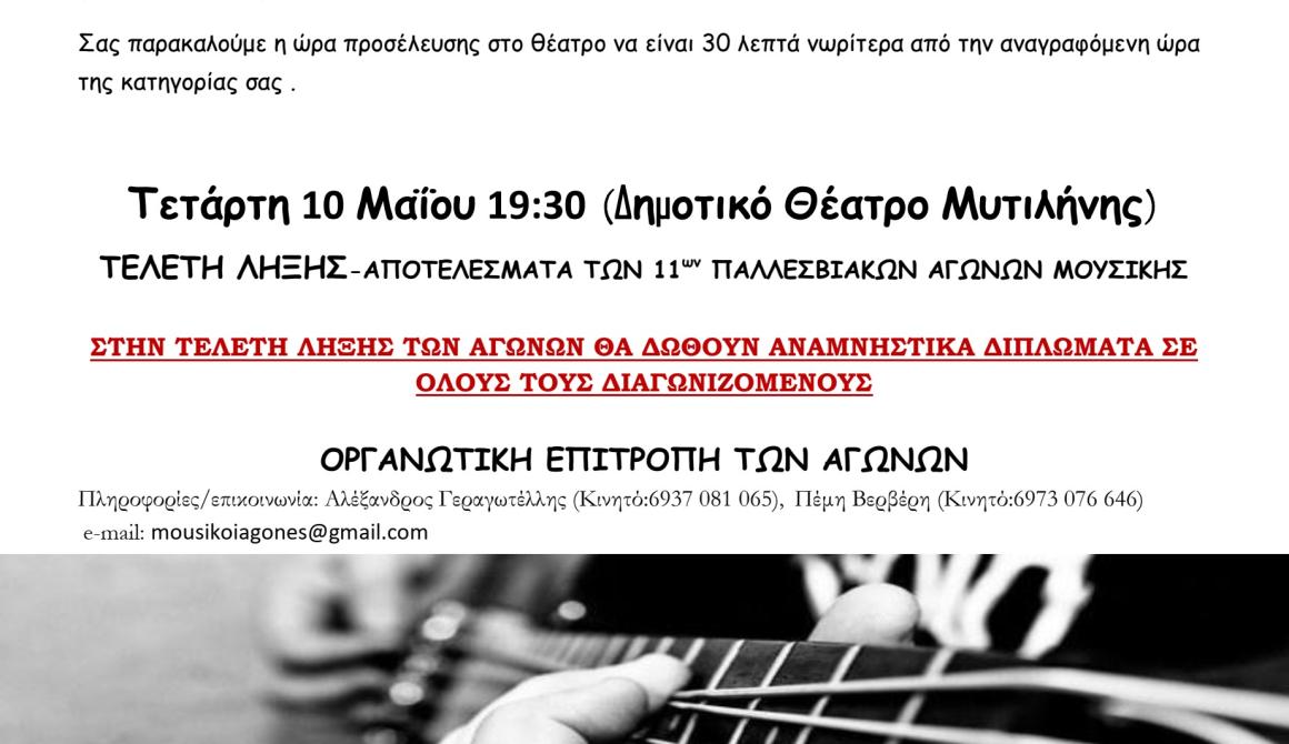 Το Μουσικό Σχολείο Μυτιλήνης διοργανώνει την Τρίτη 9 Μαΐου και την Τετάρτη 10 Μαΐου τους 11ους Παλλεσβιακούς Μαθητικούς Αγώνες Μουσικής, στο Δημοτικό Θέατρο Μυτιλήνης.