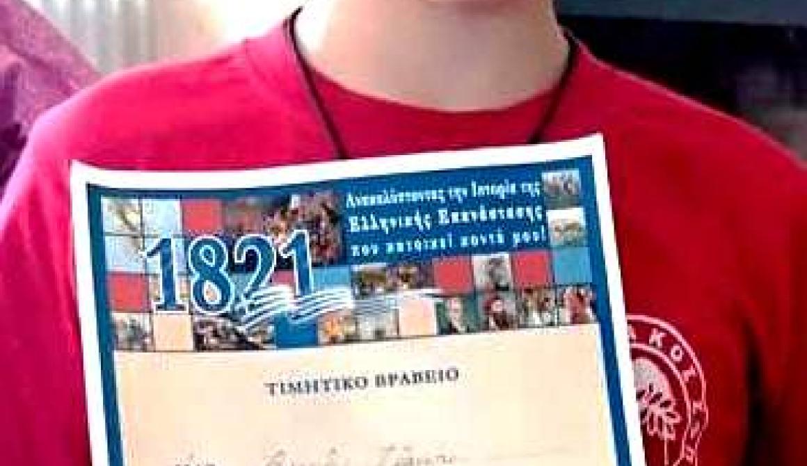Συγκεκριμένα το έργο του «Η καταστροφή του Αϊβαλιού το 1821» τιμήθηκε με 3ο βραβείο στην κατηγορία μαθητών 6-10 χρονών στον διαγωνισμό «Ανακαλύπτοντας την Ιστορία της Ελληνικής Επανάστασης που κατοικεί κοντά μου!»