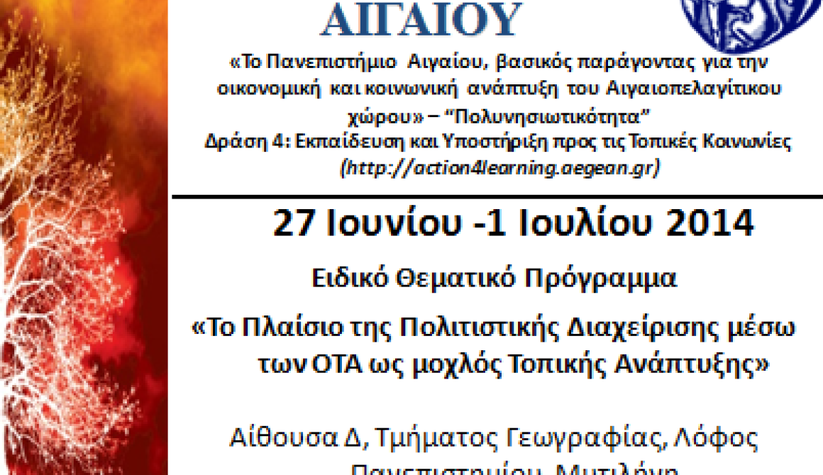 Το Πανεπιστήμιο Αιγαίου στο πλαίσιο του έργου «Το Πανεπιστήμιο Αιγαίου, βασικός παράγοντας για την οικονομική και κοινωνική ανάπτυξη του Αιγαιοπελαγίτικου χώρου – “Πολυνησιωτικότητα”» μέσω της Δράσης 4: «Εκπαίδευση και Υποστήριξη στις τοπικές κοινωνίες» διοργανώνει Ειδικό Θεματικό Πρόγραμμα με θέμα «Το Πλαίσιο της Πολιτιστικής Διαχείρισης μέσω των ΟΤΑ ως μοχλός Τοπικής Ανάπτυξης». Το πρόγραμμα θα υλοποιηθεί στην Μυτιλήνη από 27 Ιουνίου 2014 έως 01 Ιουλίου 2014.