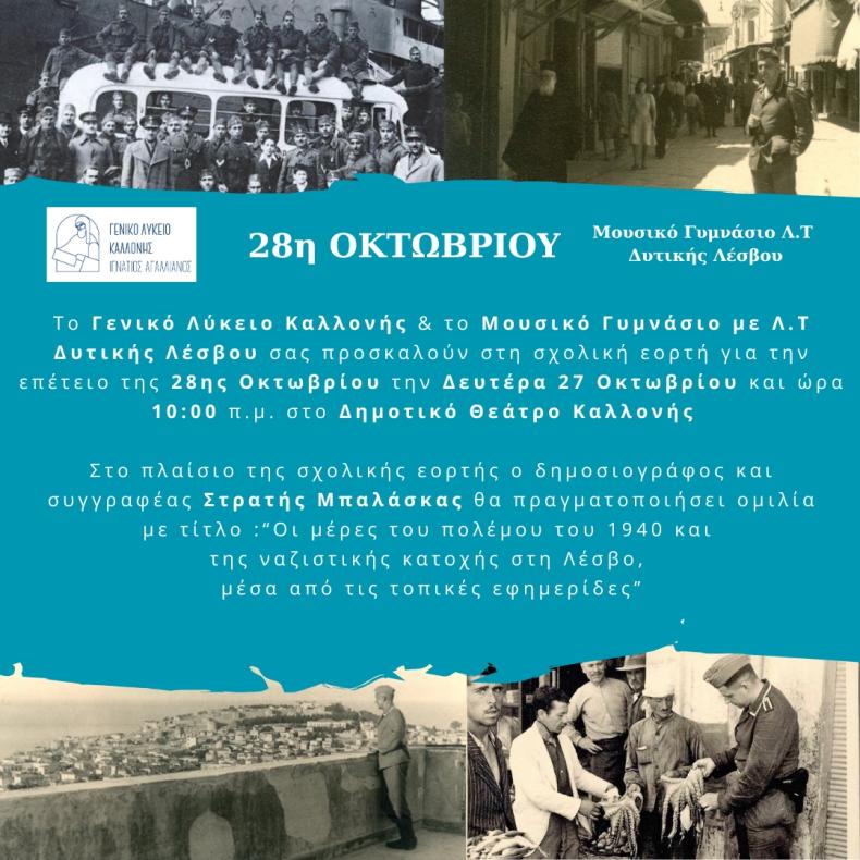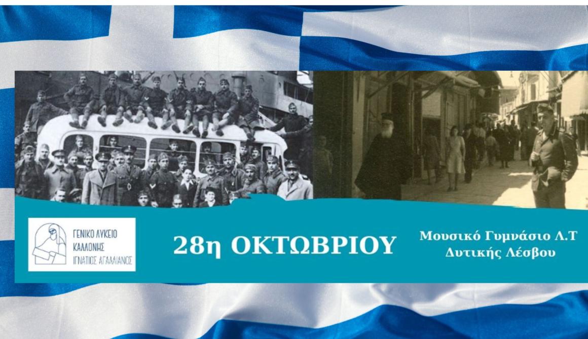 Με βαθύ σεβασμό και συγκίνηση, το Γενικό Λύκειο Καλλονής “Ιγνάτιος Αγαλλιανός” και το Μουσικό Γυμνάσιο με Λ.Τ. Δυτικής Λέσβου διοργανώνουν μια ξεχωριστή σχολική εκδήλωση αφιερωμένη στην Εθνική Επέτειο της 28ης Οκτωβρίου.