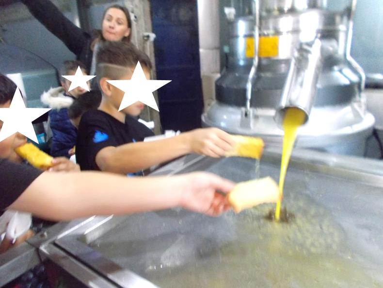 Η εμπειρία συνεχίστηκε στο ελαιοτριβείο, όπου τα παιδιά παρακολούθησαν βήμα-βήμα τη διαδρομή του ελαιόκαρπου μέχρι να γίνει το πολυτιμότερο προϊόν του νησιού. Από την πλύση, στο σπάσιμο, στην εξαγωγή – όλα τους αποκαλύφθηκαν σαν μικρό θαύμα μηχανικής και φύσης. Και το καλύτερο; Η «καπιράδα» στο τέλος: παξιμάδι βουτηγμένο σε φρέσκο, κεχριμπαρένιο αγουρόλαδο που έτρεχε εκείνη τη στιγμή. Μια γεύση που δύσκολα ξεχνιέται.