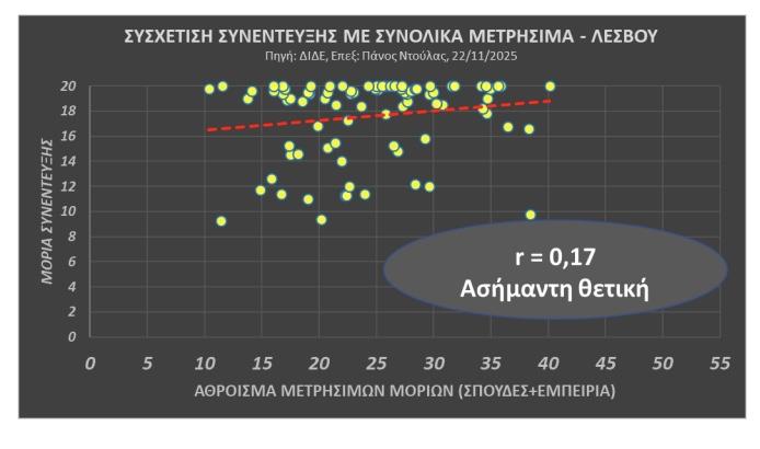 Η στατιστική το δείχνει ξεκάθαρα: η «γραμμή συσχέτισης» —δηλαδή η σχέση ανάμεσα στα προσόντα και τη βαθμολογία της συνέντευξης— στη Λέσβο είναι σχεδόν ίσια, οριζόντια. Τι σημαίνει αυτό; Ότι στη Λέσβο η συνέντευξη δεν σχετιζόταν καθόλου με τα πραγματικά προσόντα των υποψηφίων. Τίποτε δεν εξηγούσε τίποτε. Καμία λογική. Καμία συνέπεια. Αυτό δεν είναι αξιολόγηση. Είναι ρουλέτα — και κάποιος γύριζε τον τροχό.