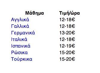 - Γλώσσες: Αγγλικά, Γαλλικά, Ιταλικά 12-18€/ώρα, Γερμανικά 13-20€/ώρα, Ρώσικα/Τούρκικα 15-20€/ώρα.