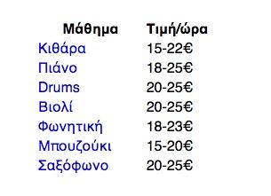- Μουσική: Πιάνο 18-25€/ώρα, Βιολί 20-25€/ώρα, Drums 20-25€/ώρα.