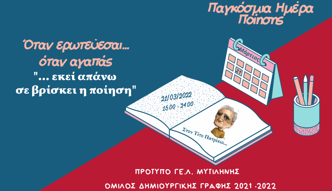 Το Πρότυπο ΓΕ.Λ. Μυτιλήνης στο πλαίσιο του Ομίλου Δημιουργικής Γραφής σας προσκαλεί στον 1ο Παλλεσβιακό Μαθητικό Διαγωνισμό Δημιουργικής Γραφής στην ποίηση με θέμα: Όταν ερωτεύεσαι, όταν αγαπάς… εκεί απάνω σε βρίσκει η ποίηση. Ο Διαγωνισμός θα διεξαχθεί την Παγκόσμια Ημέρα Ποίησης (21 Μαρτίου) και είναι αφιερωμένος στον αγαπημένο ποιητή Τίτο Πατρίκιο.