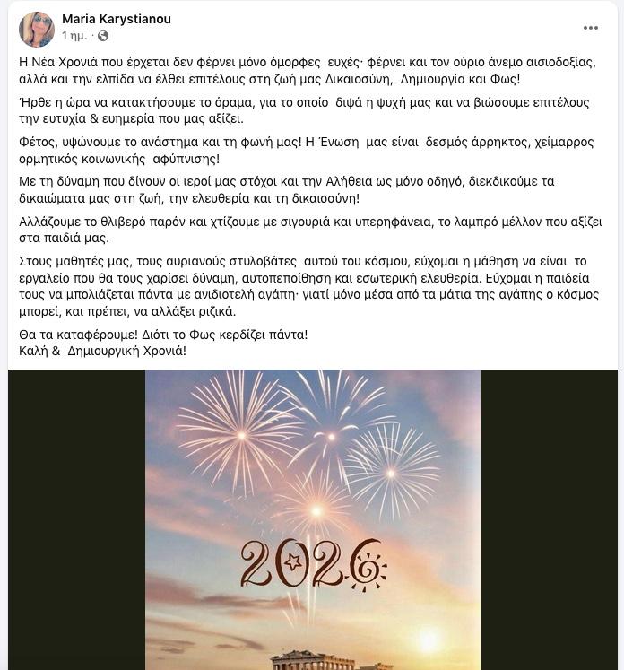 Η ανάρτηση της Μαρία Καρυστιανού για την έλευση του 2026 δεν ήταν μια τυπική ευχή αλλαγής χρόνου. Ήταν ένα κείμενο πολιτικά φορτισμένο, με λέξεις-κλειδιά που δύσκολα περνούν απαρατήρητες: Δικαιοσύνη, Ένωση, Αλήθεια, Φως, Διεκδίκηση. Όχι ως ρητορικά στολίδια, αλλά ως αξιακό πλαίσιο.