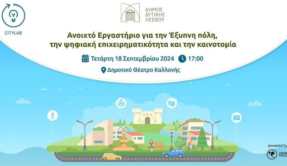 Ο Δήμος Δυτικής Λέσβου σε συνεργασία με την εταιρεία καινοτομίας και τεχνολογίας Crowdpolicy, διοργανώνει την Τετάρτη 18 Σεπτεμβρίου 2024 και ώρα 17:00, στο Δημοτικό Θέατρο Καλλονής, Ανοιχτό Εργαστήριο με θέμα: Ψηφιακή Μετάβαση, Τεχνητή Νοημοσύνη και Επιχειρηματικότητα στην τοπική κοινωνία.