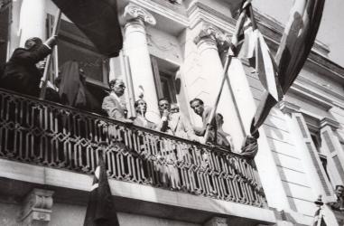 Το απόγευμα στις 2 οι καμπάνες όλων των εκκλησιών ανάγγειλαν την είσοδο στην πόλη των πρώτων αντάρτικων σωμάτων από την ύπαιθρο. Πυκνά κύματα κόσμου καταγέμισαν μέσα σε λίγη ώρα την αυλή και τους άλλους χώρους του Νομαρχιακού Μεγάρου, όπου μεταξύ άλλων έφθασε και το Ελληνοαγγλικό κομάντος που ’χε αποβιβαστεί δυο μέρες πριν στο νησί μας κι είχε έρθει σε επαφή με την οργάνωση του ΕΑΜ.