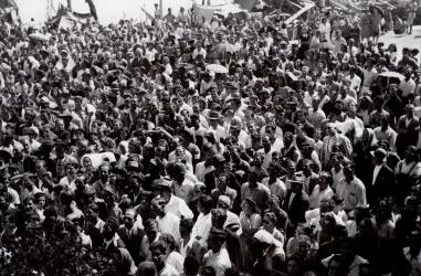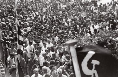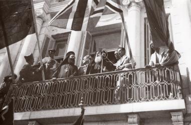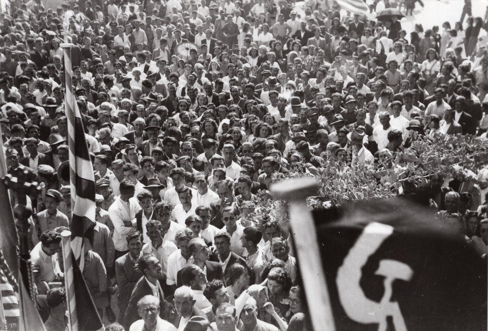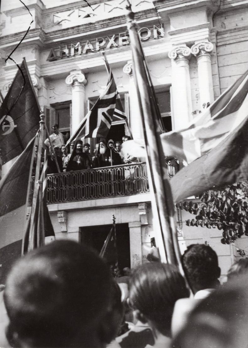 Στις 11 και 10 το θέαμα του κόσμου μπροστά και γύρω από το Δημαρχείο ήτανε πρωτόφαντο. Ποτέ δεν είδε η πόλη παρόμοια σε όγκο και μεγαλείο συγκέντρωση, Αμέτρητες χιλιάδες κόσμου στριμώχνονταν προς όλες τις πλευρές, νοιώθοντας τη χαρά του ξεσκλαβώματος βαθειά μέσα στη καρδιά (…). Πρώτος μίλησε στα συγκεντρωμένα πλήθη ο υπεύθυνος Γραφείου Πόλης σγ. Χρίστος Χριστοδούλου (…). Ζητωκραυγές και χειροκροτήματα σκέπαζαν την κάθε φράση του. Έπειτα μίλησε προς τα πλήθη από μέρους της οργάνωσης με φλογώδη ενθουσιασμό και μέσα σε γενική συγκίνηση ο συναγωνιστής Γιώργος Γιαλούρης. Ο λόγος του, ένας λόγος αντάξιος των μεγάλων στιγμών της πατρίδος μας, γεμάτος νόημα, γεμάτος περιεχόμενο έκανε βαθειά αίσθηση. Ήταν ο λόγος αληθινή πνοή της λευτεριάς που ονειρευόταν απόκρυφα η καρτερική λαϊκή ψυχή περιμένοντας, υπομένοντας και αγκομαχώντας κατά το μακρύ διάστημα της σκλαβιάς. Τα πλήθη ζητωκραύγαζαν και χειροκροτούσαν συνειδητά την κάθε φράση (…). Λίγα λόγια, αλλά γεμάτα από ενθουσιασμό είπε κατόπι ο συναγωνιστής Τσιτσιγιάννης. Ο κόσμος τον χειροκρότησε ζωηρότατα. Με τον ίδιο ενθουσιασμό μίλησε έπειτα από μέρους του Κομμουνιστικού κόμματος ο σγ. Μήτσος Χαραλαμπίδης. Ακράτητα χειροκροτήματα δονούσαν τον αέρα επί πολλά λεπτά της ώρας επίμονα. Οι ζητωκραυγές είχαν φτάσει στο κατακόρυφο. Όσο οι λαϊκές μάζες ένοιωθαν πως είναι λεύτερες πια να εκφράσουν τον ενθουσιασμό τους, τόσο πιο πολύ ζητωκραύγαζαν και χειροκροτούσαν τον ρήτορα. Μετά τον σγ. Μήτσο Χαραλαμπίδη μίλησαν με ζωηρό παλμό από μέρους της ΕΠΟΝ ο σγ. Αριστείδης Ραπίτης και με λίγες αλλά χαρακτηριστικές φράσεις η συναγωνίστρια Μαρίκα Ζαγορίσιου. Μετά τις ζητωκραυγές που κάλυψαν και τους λόγους αυτούς τραγουδήθηκε από τα μέλη της ΕΠΟΝ το Επονίτικο Εμβατήριο και κατόπι η μουσική του Ορφανοτροφείου παιάνισε τον Εθνικό Ύμνο. Η συγκέντρωση διαλύθηκε κατά τις 1 μετά το μεσημέρι.