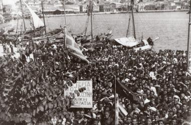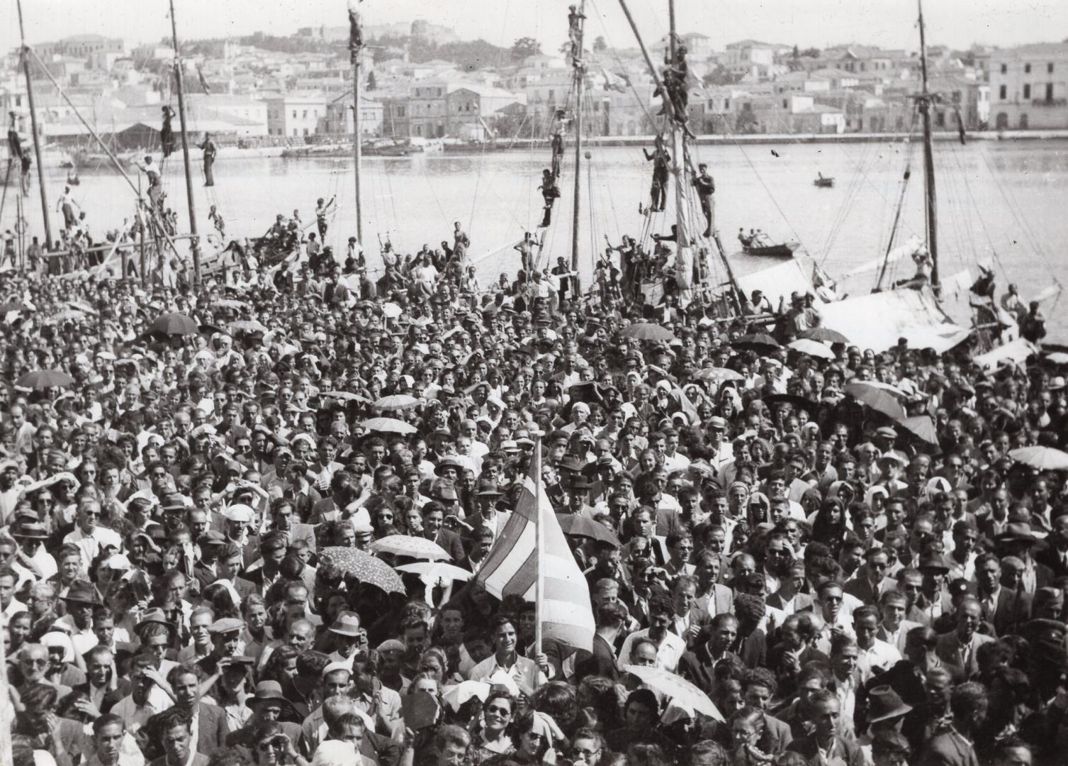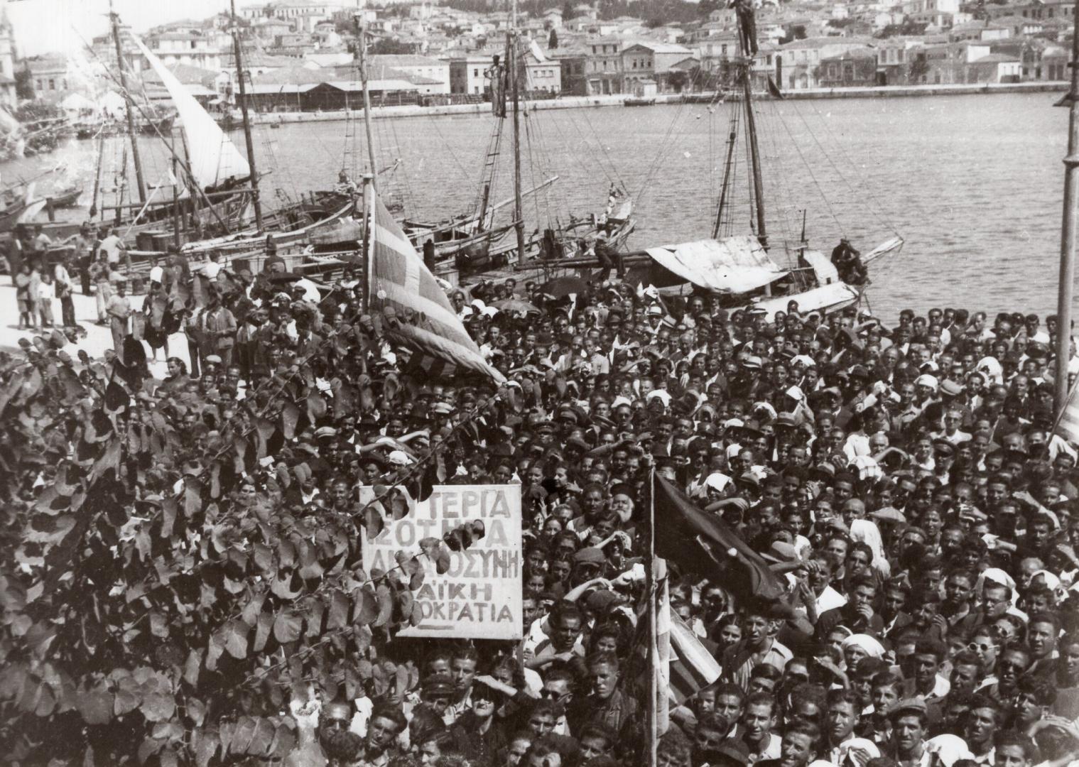 Αφού έγινε η αναχώρηση του πρώτου γεμάτου από στρατό και πυρομαχικά βαποριού άρχισαν οι ετοιμασίες και για το δεύτερο. Τούτο μόλις στις 5 και τέταρτο σήκωσε την άγκυρά του μαζί μ’ ένα μεγάλο βενζινόπλοιο που παρέλαβε τους τελευταίους Γερμανούς. Δεν πέρασε όμως πολύ ώρα και το βενζινόπλοιο ξαναγύρισε και έβαλε φωτιά σ’ ένα άλλο που ’ταν γεμάτο πυρομαχικά, το ανατίναξε και μέσα σε λίγα λεπτά βυθίστηκε. Άπειρα πλήθη κόσμου που πέρασαν τη νύκτα τους άγρυπνα στους εξώστες και στα παράθυρα παρακολουθούσαν τώρα απ’ όλες τις υψηλές συνοικίες το θέαμα της άδοξης αναχώρησης των Γερμανών. Σύγχρονα, τα μέλη του ΕΑΜ είχανε πάρει θέση στα σταυροδρόμια και στις αρτηρίες που συγκοινωνούν με την αγορά, απαγορεύοντας την κυκλοφορία, για να δοθεί καιρός στα αρμόδια συνεργεία να ξεκαθαρίσουν τους δρόμους της προκυμαίας και της αγοράς, από τις νάρκες που είχαν κατασπείρει οι Γερμανοί σε διάφορα σημεία. Έτσι μόλις κατά τις 9:30 κατορθώθηκε να επιτραπεί η κυκλοφορία και να παίξουν χαρμόσυνα οι καμπάνες των εκκλησιών. Τότε απ’ όλες τις συνοικίες χείμαρροι κόσμου άρχισαν να κατεβαίνουν στην προκυμαία και να παίρνουν θέση γύρω στο Δημαρχείο όπου θα γινόταν η μεγάλη εορταστική συγκέντρωση. Η μεγάλη λαϊκή μάζα, η καθαυτό δυναμική μάζα, τράνταξε δυνατά τον αέρα με ζητωκραυγές και χειροκροτήματα για τη λευτεριά. Άλλα πλήθη με μεγάλες χαρμόσυνες επιγραφές και με σημαίες κατέβαιναν από τα περίχωρα συντεταγμένα. Όγκοι πλήθους με τις συμμαχικές σημαίες και της Ελλάδας έρχονταν από την αγορά στο Δημαρχείο. Ο ενθουσιασμός όλου του κόσμου είχε φθάσει στο κατακόρυφο (…). Στο μεταξύ το Γραφείο Πόλης του ΕΑΜ εγκαταστάθηκε στη Νομαρχία (σ.σ. σήμερα κτίριο γραμματείας Πανεπιστημίου Αιγαίου στην οδό Βουρνάζων) όπου υψώθηκε και η Ελληνική Σημαία. Αλλά και όλες οι εξουσίες του τόπου πέρασαν αμέσως στα χέρια της οργάνωσης.
