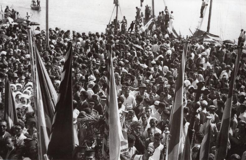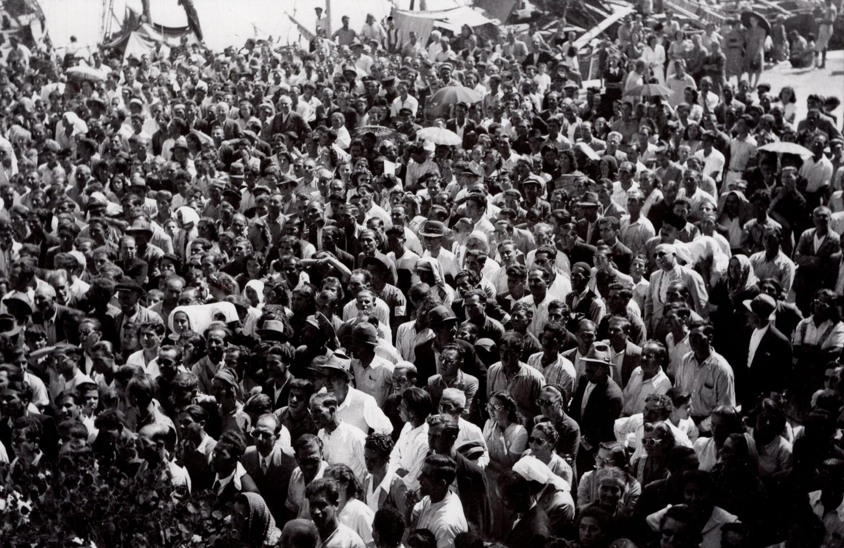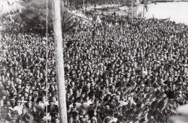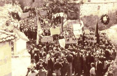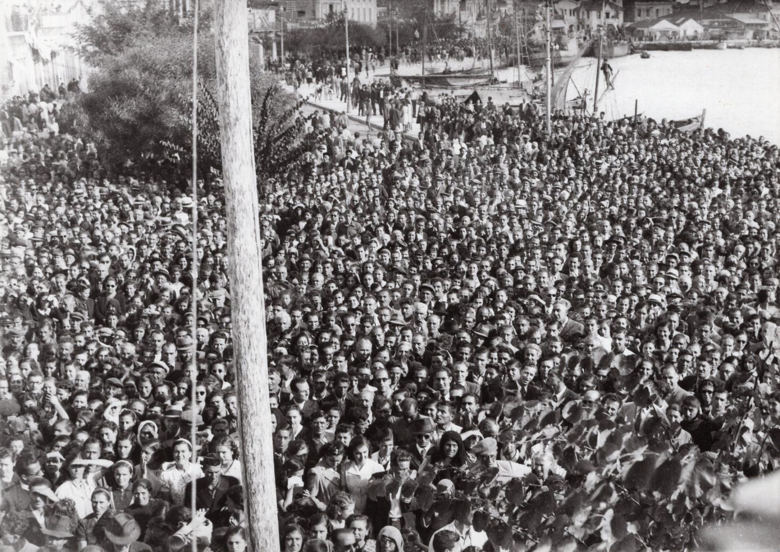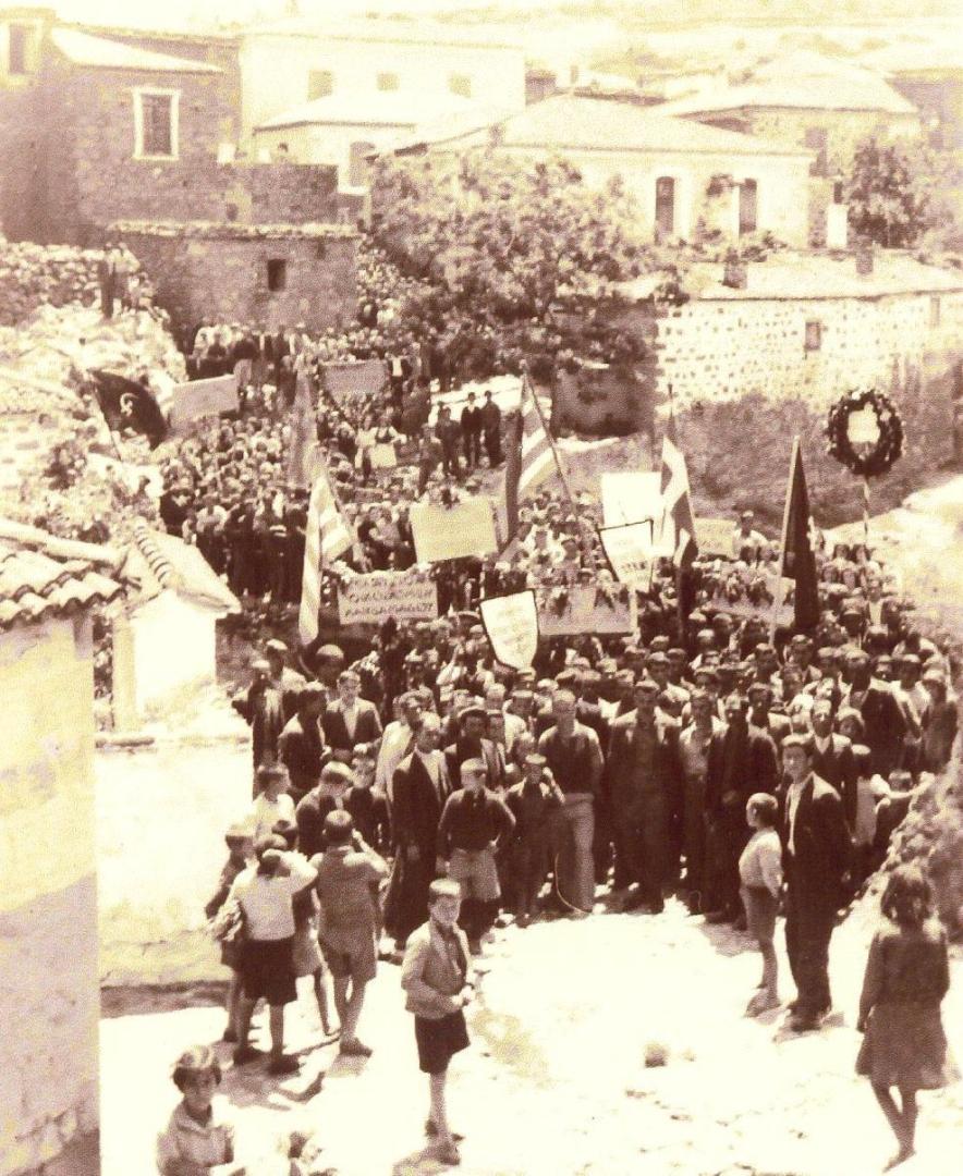 Στις 7 το βράδυ άρχισε η μεγάλη παρέλαση από τον Ταρλά με την ακόλουθη σειρά και μέσα σε καινούριες πάλι ζητωκραυγές και χειροκροτήματα. Πρώτα περνούσαν τμήματα του ΕΛΑΣ με την πολεμική τους εξάρτηση, ερχόντουσαν ύστερα οι συναγωνιστές και συναγωνίστριες της ΕΠΟΝ και κατόπιν οι συναγωνιστές και συναγωνίστριες του ΕΑΜ. Η παρέλαση έγινε από το δρόμο της Μεραρχίας (σ.σ. οδός Καβέτσου) από την Εθνική Τράπεζα (σ.σ. τώρα κτίριο Νομαρχίας), την προκυμαία και την αγορά. Κατά την ώρα της παρέλασης τα φώτα της προκυμαίας ήταν αναμμένα. Απ’ όπου περνούσαν συντεταγμένα τα τμήματα της Οργάνωσης ο κόσμος χειροκροτούσε με ολοένα αυξανόμενο ενθουσιασμό και συγκίνηση. Μεγάλη εντύπωση έκαναν σ’ όλο τον κόσμο όσα τμήματα του ΕΛΑΣ ήρθανε στην πόλη μας και πήρανε μέρος στην παρέλαση για την τέλεια πολεμική τους εξάρτηση. Ήταν ένας αληθινός στρατός, οργανωμένος με θαυμαστό στρατιωτικό σύστημα. Εντύπωση έκανε και το πλήθος των συναγωνιστριών της ΕΠΟΝ και του ΕΑΜ, τόσο, που ’δωσαν την αφορμή να ζητούν το γράψιμό τους στην οργάνωση και άλλες πάρα πολλές νέες. Στην οργάνωση ζητούν να γραφούν και πολλοί πολίτες παρακαλώντας να γίνουν δεκτοί από τα αρμόδια στελέχη της και να ενισχύσουν με κάθε τρόπο το έργο της. Η εγγραφή γίνεται με πρόταση συναγωνιστριών ή συναγωνιστών που γνωρίζουν το ηθικό ποιόν κάθε προτεινόμενου και εγγυώνται γι’ αυτό.