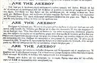 Η Λέσβος είναι από χθες την αυγή ελεύθερη. Ακόμα δεν μπορούμε να πιστέψουμε πως αυτή ήταν η αυγή που ονειρευόταν η λεσβιακή ψυχή, καταδυναστευμένη και περίλυπη, επί τριάμισι ολάκερα χρόνια βαριά σαν μολύβι, μαύρα πιο πολύ κι’ από την πίσσα. (…)