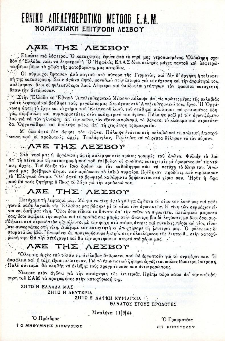 Παραθέτουμε το χρονικό της απελευθέρωσης όπως καταγράφτηκε στο με αριθμό 1 φύλλο (2η περίοδος) της εφημερίδας «Ελεύθερη Λέσβος», οργάνου της Ν.Ε. του ΕΑΜ Λέσβου, την επόμενη μέρα της απελευθέρωσης, Δευτέρα, 11/9/1944: