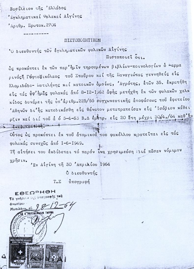 Από κει τους πήραν και τους περιέφεραν σε διάφορες φυλακές. Στην Αλικαρνασσό, στα Τρίκαλα, στη Χαλκίδα, απ’ όπου έφυγε στις 8 του Δεκέμβρη 1962 για να πάει στην Αίγινα, όπου κρατήθηκε μέχρι τις 30 του Απρίλη 1964, οπότε τους απελευθέρωσαν.