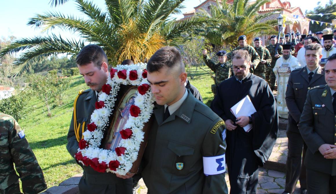 Κατά τον εορτασμό με εξαιρετική τιμή και μεγάλη ευλογία πραγματοποιήθηκε η υποδοχή της Τιμίας Κάρας του Αγίου, που μετέφερε ο Σεβασμιότατος Μητροπολίτης Μυτιλήνης κ.κ. Ιάκωβος. Κατά τον εορτασμό τελέστηκε Πανηγυρική Αρχιερατική Θεία Λειτουργία μετά αρτοκλασίας και περιφορά της Τιμίας Κάρας του Αγίου στο Στρατόπεδο.