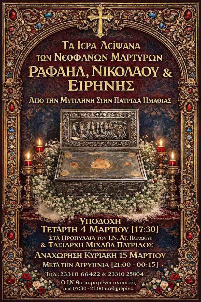 Ένα σημαντικό εκκλησιαστικό γεγονός αναμένεται να συγκεντρώσει το ενδιαφέρον των πιστών στις αρχές Μαρτίου, καθώς τα Ιερά Λείψανα των Αγίων Νεοφανών Μαρτύρων Ραφαήλ, Νικολάου και Ειρήνης θα μεταφερθούν από τη Μυτιλήνη στην Πατρίδα Ημαθίας.
